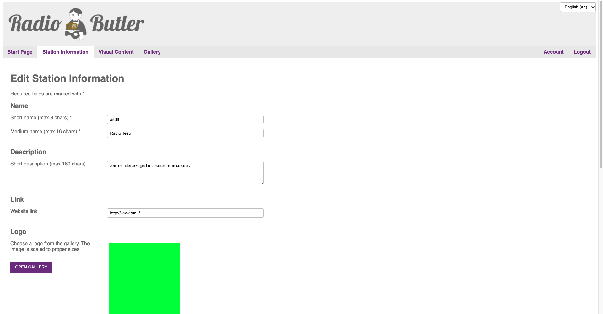 To get started, you need to input the informative content of your station to Radio Butler first. This happens in a station info -view.