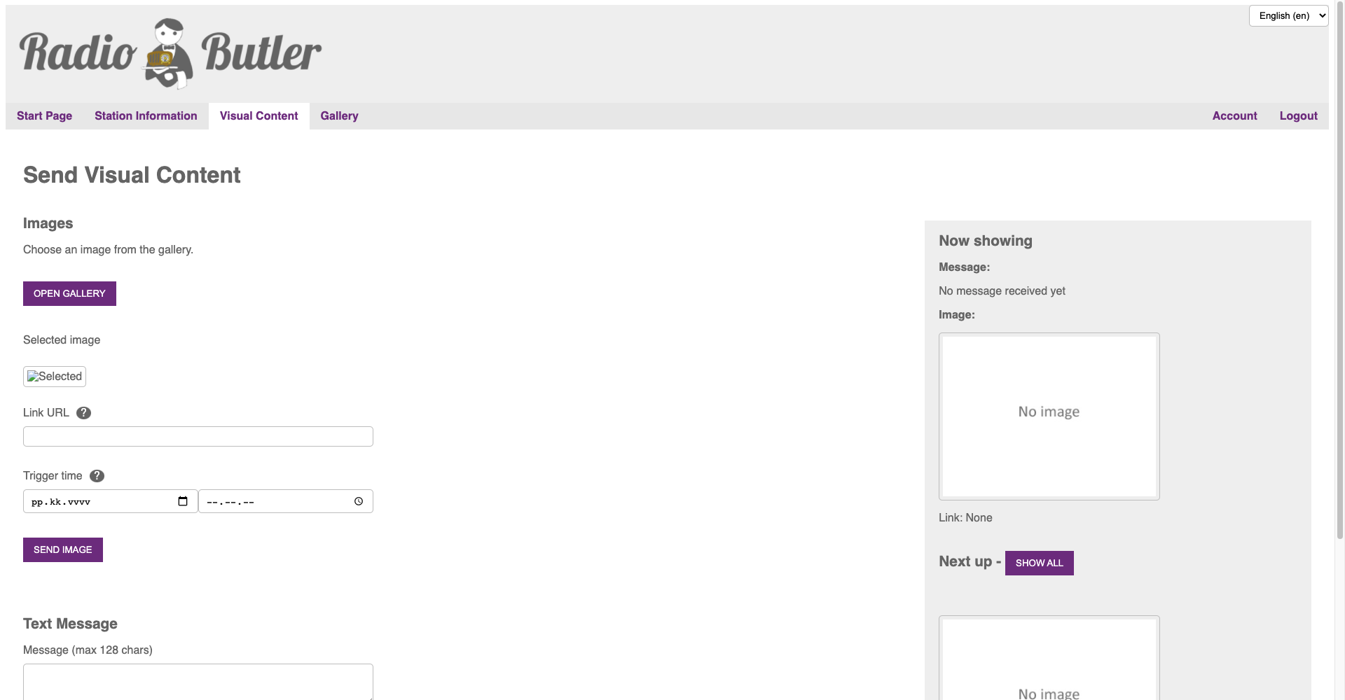 When you have saved the station info, you are ready to send visual content to your listeners. This happens in a visual content -view.